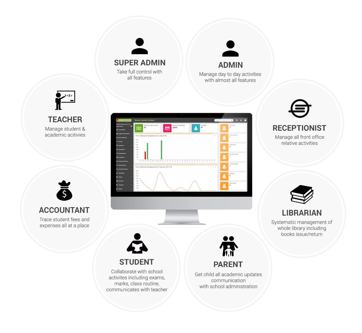 6 User’s roles Admin, Accountant, Teacher, Librarian, Parent & Student for their different
